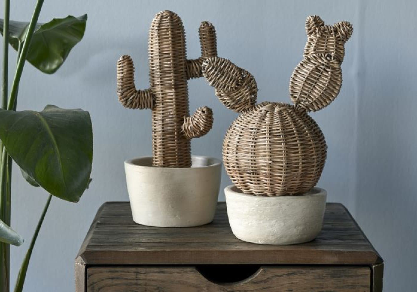 Aktuell erlebt das Material jedoch als zu allen Einrichtungsstilen passender Eyecatcher ein Comeback: Ob als Lampenschirm, Couchtisch oder ausgefallenes Deko-Element (wie die beiden Kakteen aus Rattan im folgenden Bild), das Naturprodukt, welches aus der ostasiatischen Rotangpalme hergestellt wird, passt sich durch die unterschiedlichsten Flecht- und Verarbeitungstechniken gekonnt in jeden Raum ein. Rattan ergänzt sehr stimmig ein Wohnkonzept im sogenannten kolonialen Einrichtungsstil, passt aber genauso zum Scandi Style, einem maritimen Wohnstil oder dem Landhaus-Look.