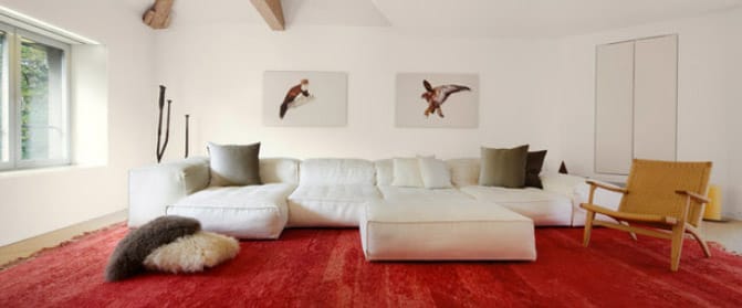 Auch kann es reizvoll sein, mehrere Stilrichtungen und deren Elemente miteinander zu kombinieren. Am besten bringen Sie Farbe in die eigenen vier Wände, wenn Sie mit einzelnen Elementen, wie zum Beispiel dem Teppich und passenden Sofakissen oder Plaids farbige Akzente setzen. Denkbar sind hier viele helle Farbkombis oder ein Zusammenspiel von kräftigen Farben wie Rot, Grün, Gelb und Weiß. Experimentieren Sie mit verschiedenen Positionen des Teppichs im Raum – Studien haben ergeben, dass die Wirkung einer farbigen Fläche – also auch die eines Teppichs – auch von deren Ausrichtung und Position abhängt. Rot, Blau oder Grün wirken demnach im gleichen Raum an Decke, Wand und Boden völlig anders. Auch der Lichteinfall spielt hierbei natürlich eine Rolle.