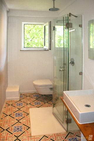 Beim Badezimmer zeigen sich die schwellenlose Durchtritte gleich mehrmals: Da wäre zuerst der Eintritt in das Badezimmer, zweitens aber auch der schwellenlose Durchtritt zur Dusche. Hier gibt es ebene Duschtassen, die ein bequemes Hineinschieben eines Rollators oder Rollstuhls ermöglichen.