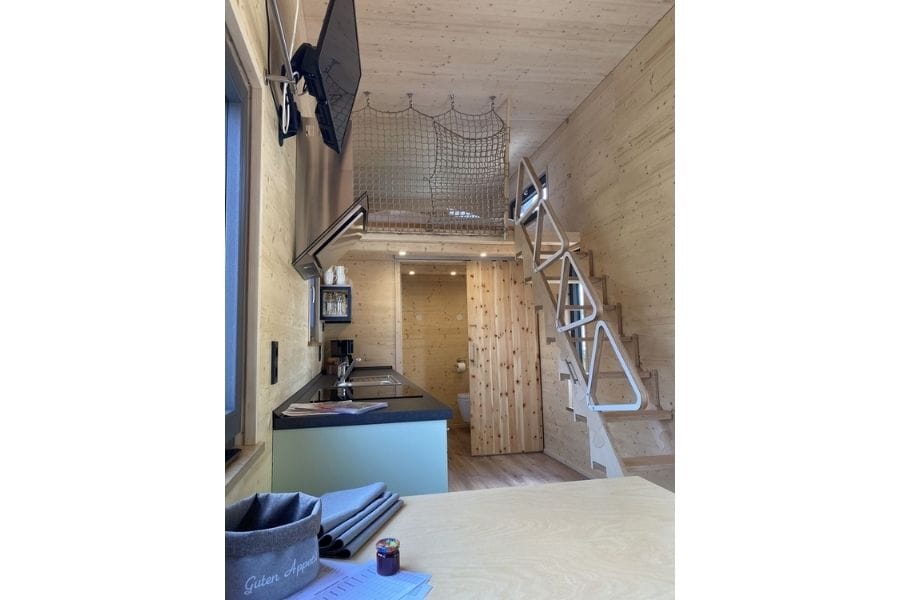 Allgäu, Deutschland: Erholung in ländlicher Umgebung ist auf dem familiengeführten Ferienhof garantiert. Neben drei bestehenden Ferienwohnungen gibt es auf dem herrlich gelegenen Bauernhof seit Neuestem auch ein selbst erbautes Tiny House, welches Platz für 2 Erwachsene und 2 kleine Kinder bietet. Es erwartet Sie hier ein kleines von Zirbenholzduft durchflutetes Ferienhaus, ausgestattet mit allem, was das Herz begehrt: eine komplett eingerichtete Küche, eine gemütliche Sitzecke, ein Schlafloft mit Zirbenholz-Doppelbett und eine ausziehbare Couch. Ein Badezimmer mit Dusche und WC und eine große Terrasse mit Sitzmöbeln runden das Angebot ab. Die Lage ist für Radausflüge, Wanderungen, Skilanglauf, zum Baden und insgesamt für einen Familienurlaub bestens geeignet.