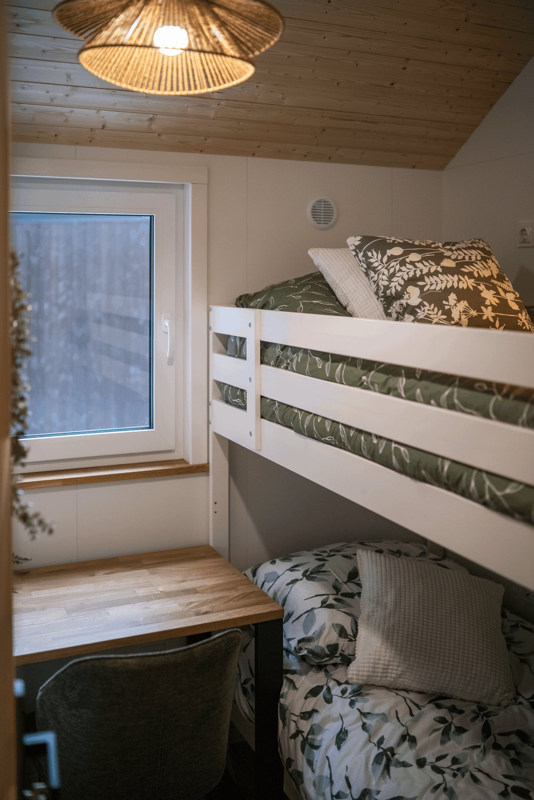 Sky bietet eine moderne, komfortable Wohnlösung für alle, die einen geräumigeren Dauerwohnsitz suchen. Dieses einstöckige Haus mit Satteldach verfügt über ein geräumiges Wohnzimmer, das in eine Küchenzeile übergeht. Das Haus bietet außerdem zwei Schlafzimmer: ein größeres mit einem bequemen Bett, Nachttischen und einem großen Kleiderschrank sowie ein kleineres, vielseitig nutzbares Zimmer, das als Kinder-, Gästezimmer oder Büro genutzt werden kann.
