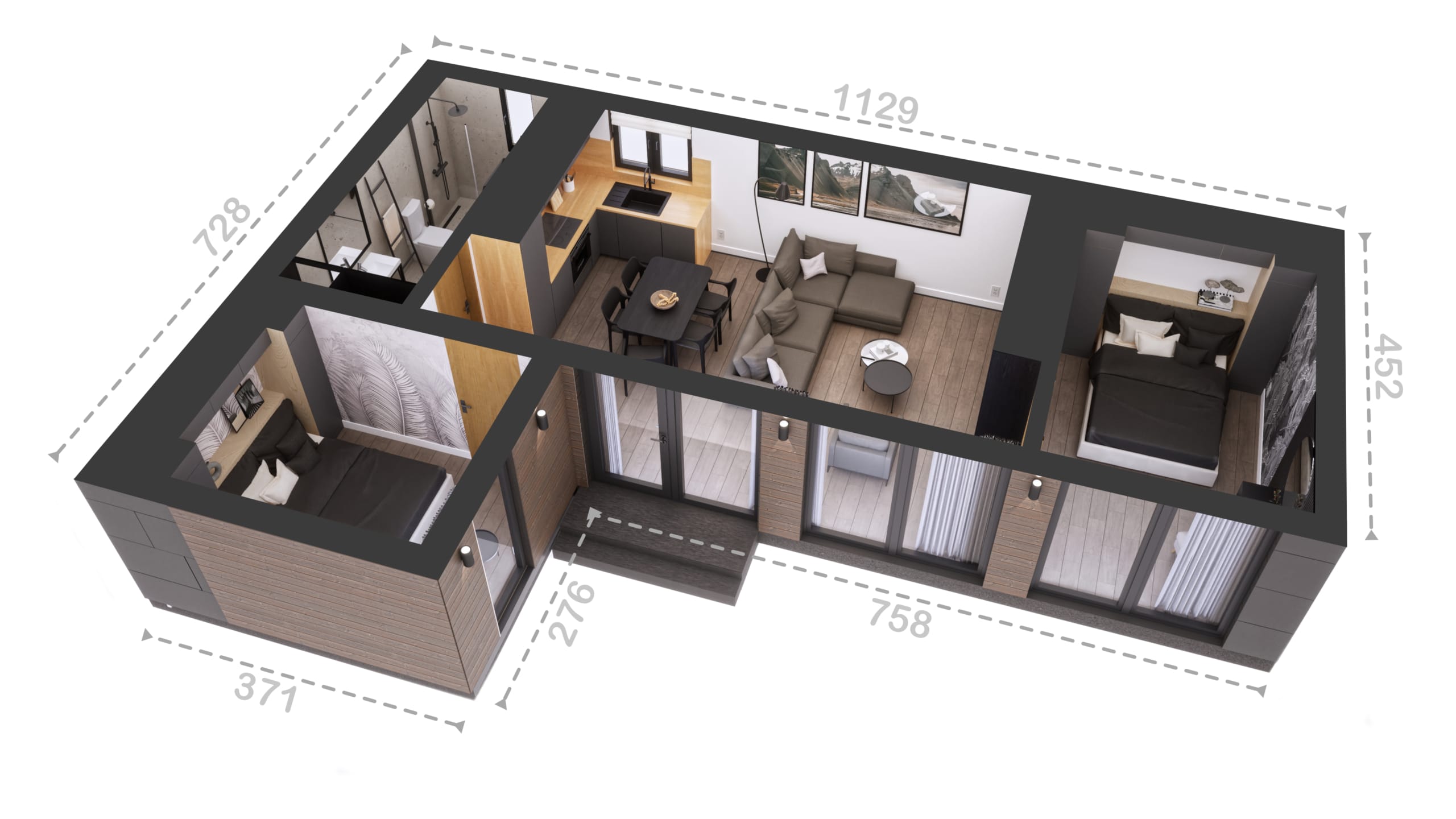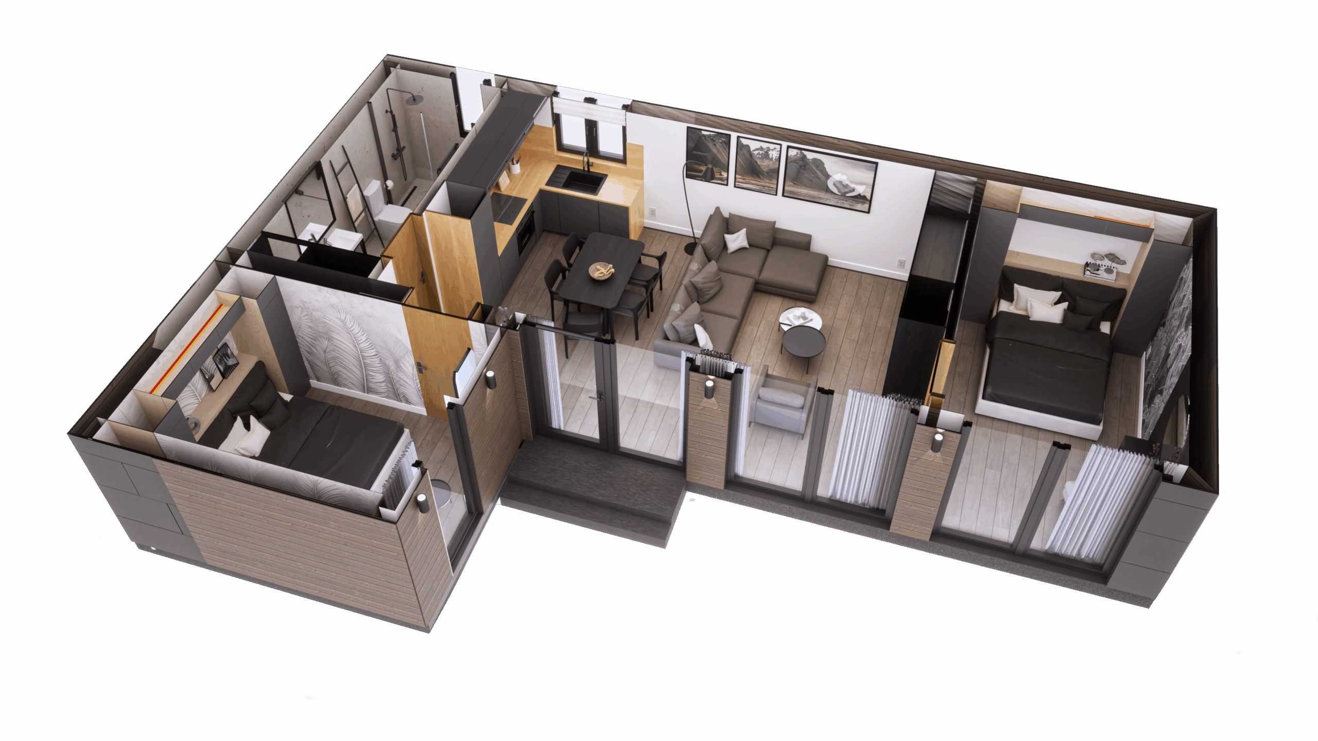 Dieses Modell verfügt über einen L-förmigen Grundriss mit 56 m² Nutzfläche und umfasst ein geräumiges Wohnzimmer mit Küche, zwei komfortable Schlafzimmer und ein voll ausgestattetes Badezimmer. Das Konzept ist vollständig anpassbar – gestalten Sie Ihr Haus in L- oder U-Form oder fügen Sie sogar ein zweites Stockwerk hinzu.
