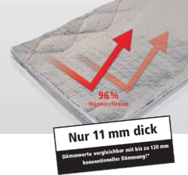 Die derzeit überwiegend eingesetzten Dämmstoffe, wie Polystyrolschaum oder Mineralwolle, reduzieren den Wärmedurchgang. ISUM MF 14 geht hier einen Schritt weiter: Es unterbindet zusätzlich die Wärmeübertragung mittels Infrarotreflektierender Oberflächen, und dies mit einem Wirkungsgrad von 96 %. Diese Erweiterung des Wirkungsspektrums führt zu völlig neuen Lösungsmöglichkeiten. Bauteilaufbauten können deutlich dünner werden, ohne Verlust der Dämmleistung. Hier kann je nach Anforderungen der Statik ohne Verlust der Dämmleistung die Wanddicke deutlich reduziert und dadurch mehr Wohnraum geschaffen werden.