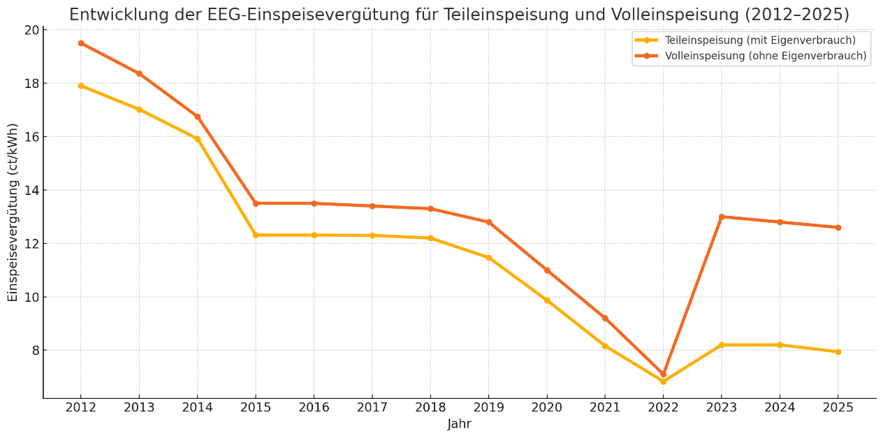 - EEG-Vergütung: bis 12,60 Cent/kWh (Volleinspeisung bis 10 kWp).