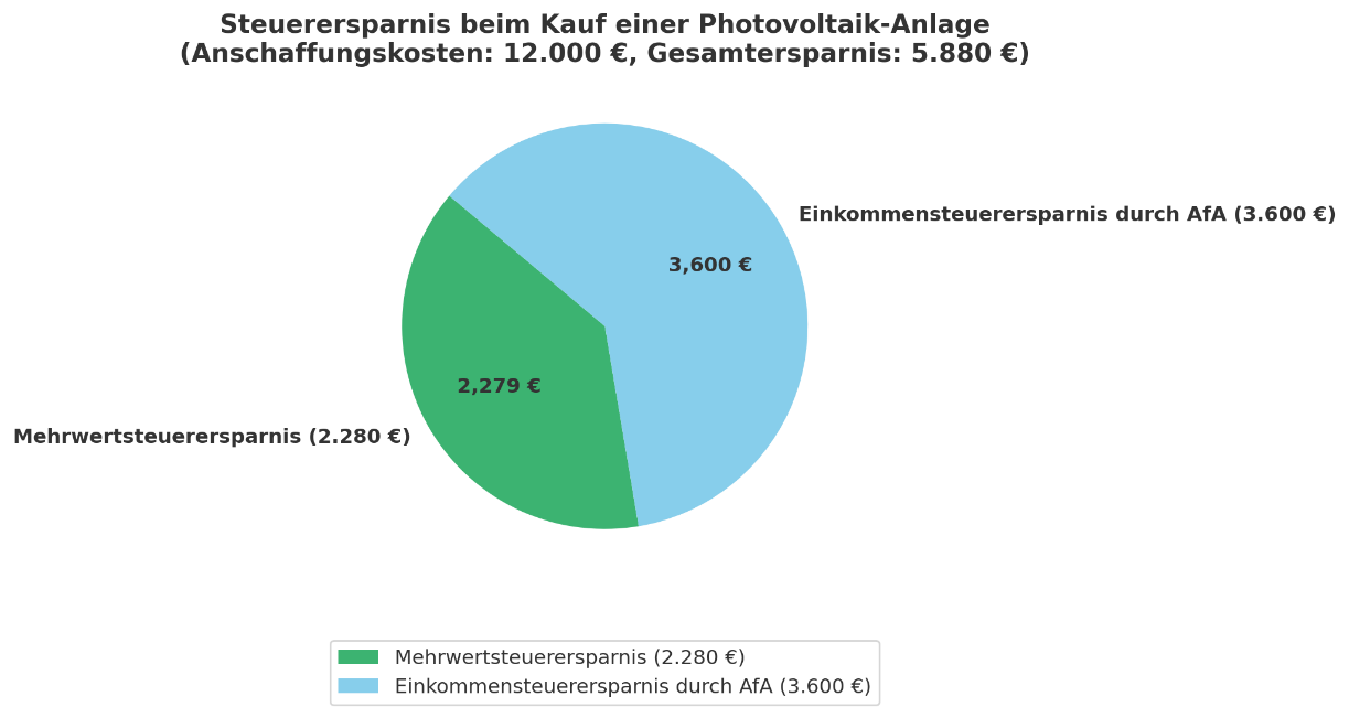 - Ein Eigenheimbesitzer investiert 12.000 Euro in eine 10-kWp-Anlage. Dank der Mehrwertsteuerbefreiung spart er direkt rund 2.280 Euro. Zusätzlich profitiert er jedes Jahr von der steuerlichen Abschreibung, wodurch seine Steuerlast deutlich sinkt.