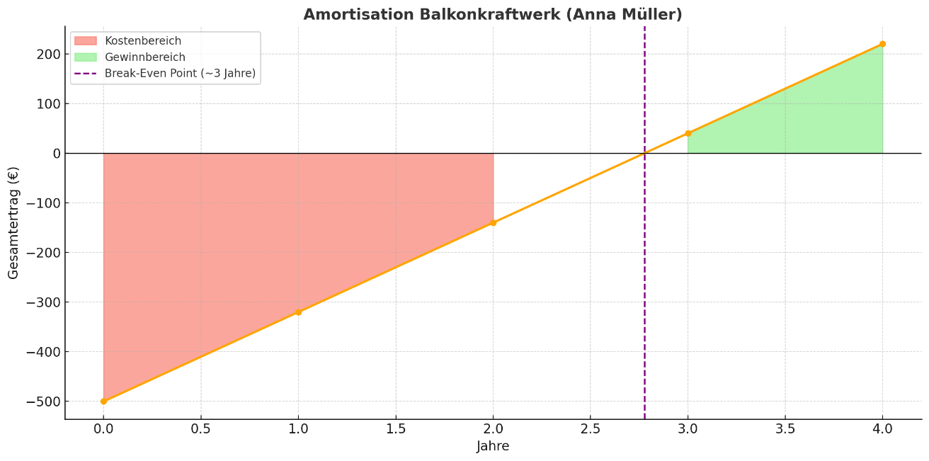 Anna Müller wohnt zur Miete in Köln-Ehrenfeld und hat 2025 ein 600-Watt-Balkonkraftwerk angeschafft. Die Gesamtkosten betrugen 800 €, wovon die Stadt Köln 300 € übernahm. Anna spart jährlich etwa 180 € an Stromkosten, sodass sich ihre Investition bereits nach weniger als drei Jahren bezahlt macht.