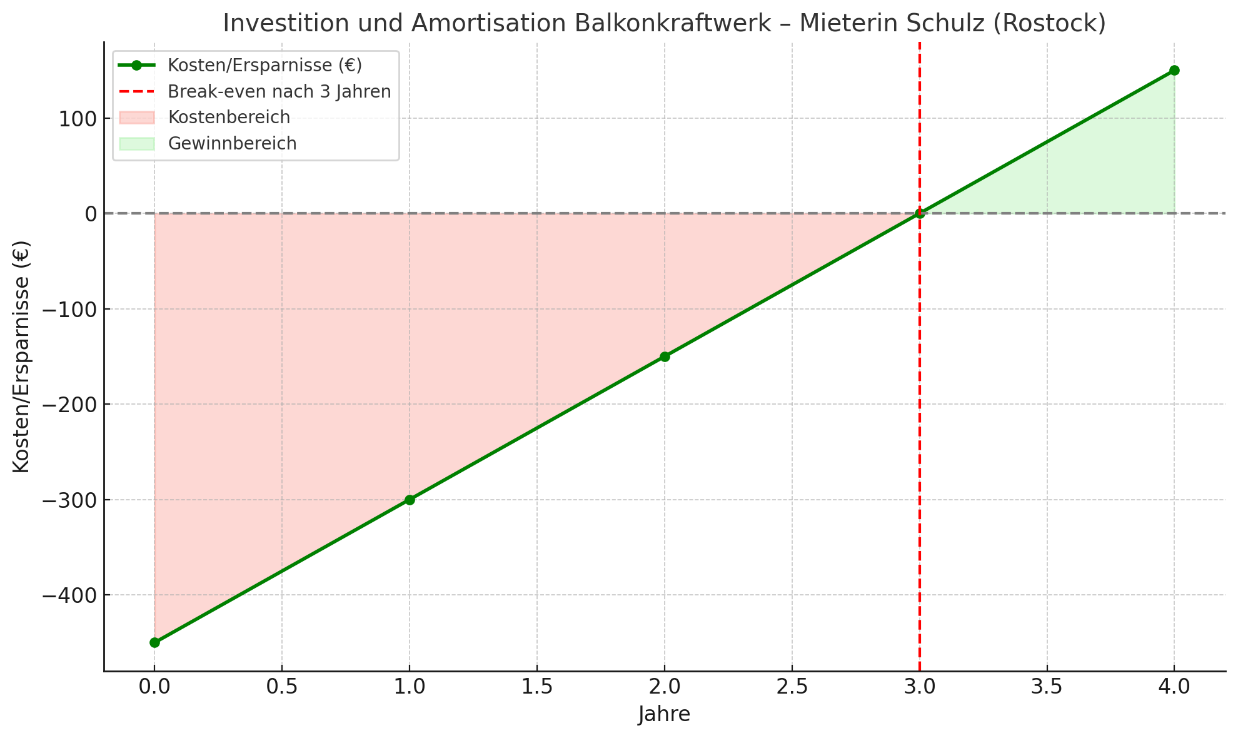 - Mieterin Schulz aus Rostock kauft ein Balkonkraftwerk für 950 € und erhält einen 500 € Landeszuschuss. Ihre jährliche Stromersparnis liegt bei etwa 168 €, wodurch sich die Anlage bereits nach drei Jahren vollständig bezahlt macht.