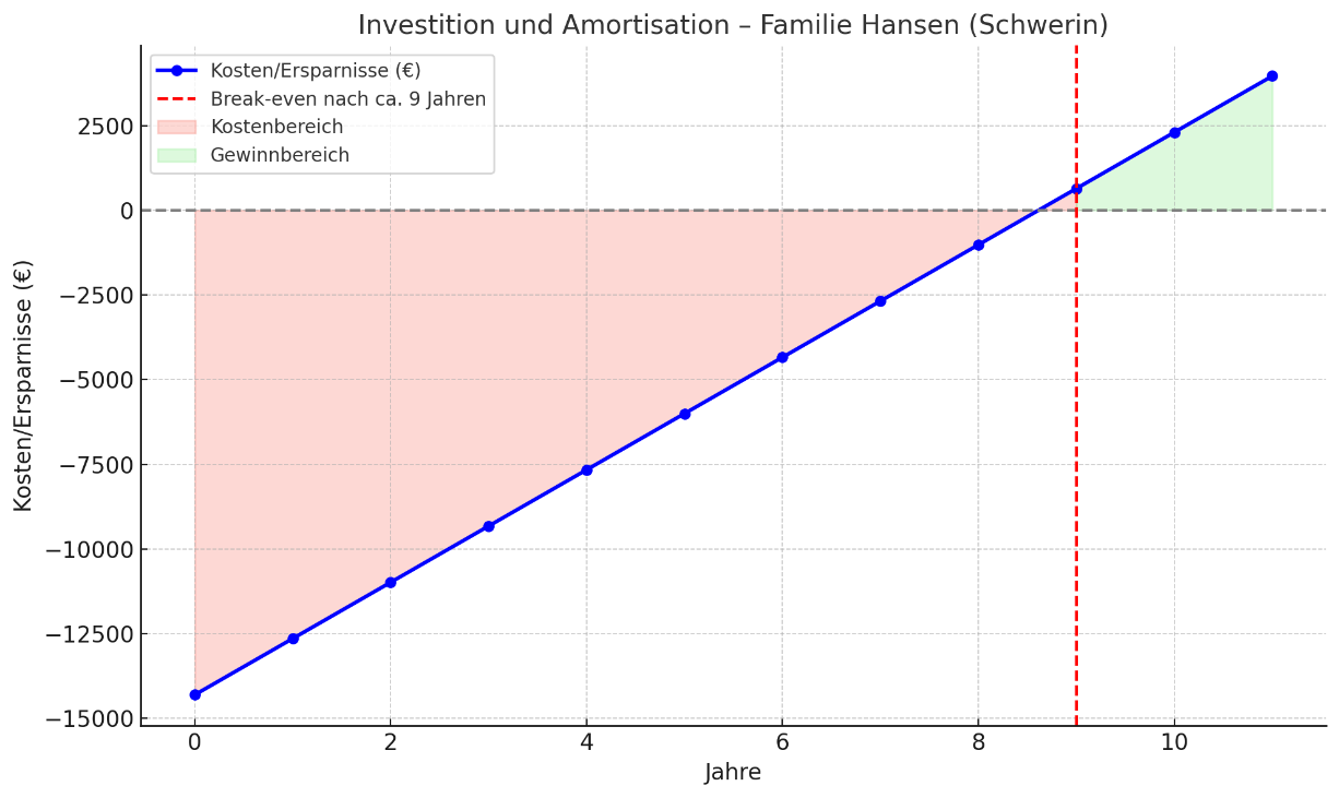 - Familie Hansen aus Schwerin installiert eine 8 kWp PV-Anlage (12.000 €) und eine Solarthermie-Anlage (6.000 €). Dank KfW-Kredit und einem 30 % Zuschuss auf die Solarthermie sparen sie direkt ca. 3.700 €. Ihre jährlichen Einsparungen durch Eigenverbrauch und Einspeisung liegen bei rund 1.360 €, plus 300 € Heizkosteneinsparung. Nach etwa 9-10 Jahren amortisiert sich die Anlage vollständig.