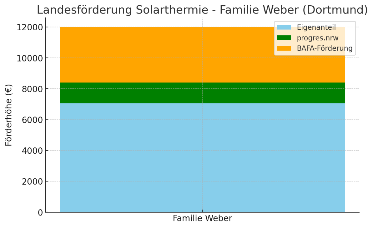 Familie Weber aus Dortmund installiert eine Solarthermieanlage (15 m²) für Warmwasser und Heizungsunterstützung. Die Gesamtkosten belaufen sich auf 12.000 €. Durch progres.nrw erhält sie einen Zuschuss von 1.350 € (90 €/m²). Zudem bekommt sie vom BAFA weitere 3.600 € (30 %). Insgesamt spart Familie Weber so 4.950 € an Investitionskosten.