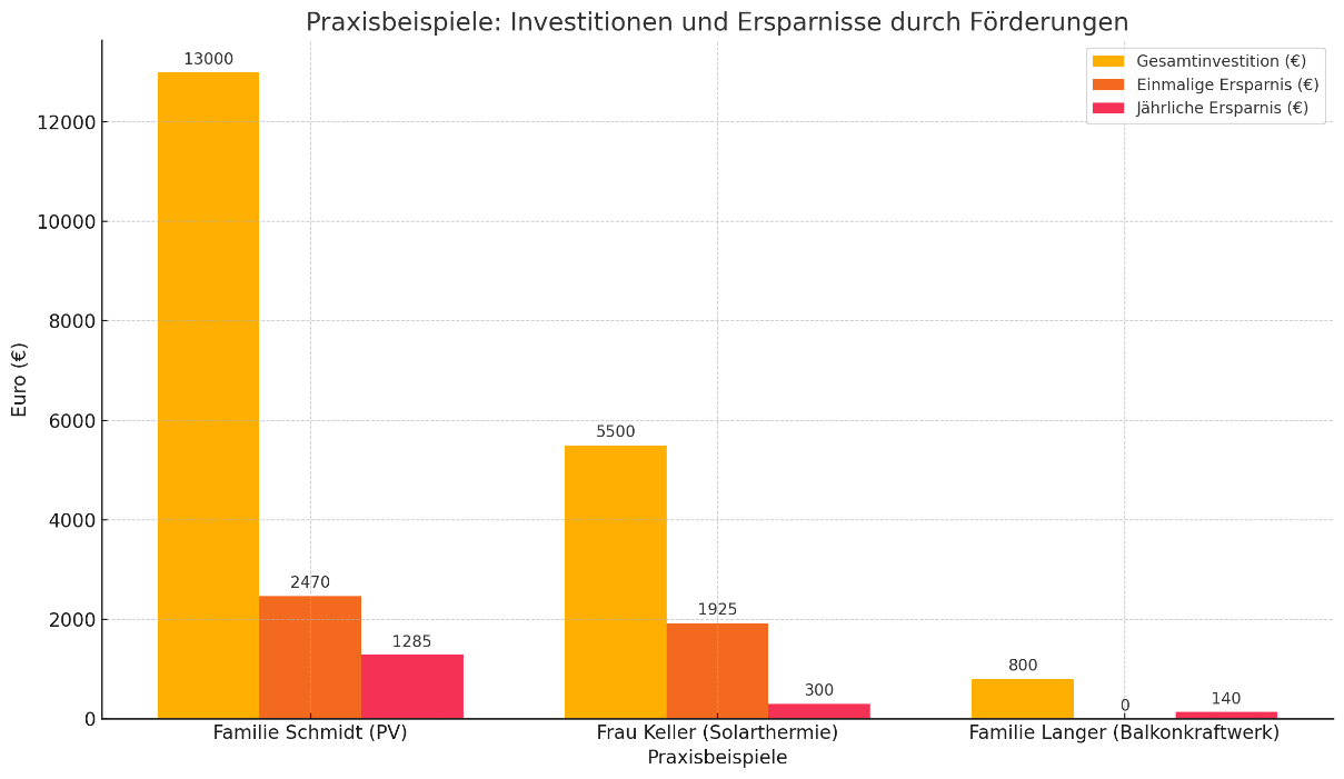 Frau Keller in St. Wendel installiert eine Solarthermie-Anlage für Warmwasser für etwa 5.500 €. Durch BAFA-Zuschüsse (30 % plus Bonus) reduziert sie die Kosten auf 3.575 €. Sie spart jährlich etwa 300 € an Heizkosten und amortisiert die Anlage innerhalb von ca. 12 Jahren.