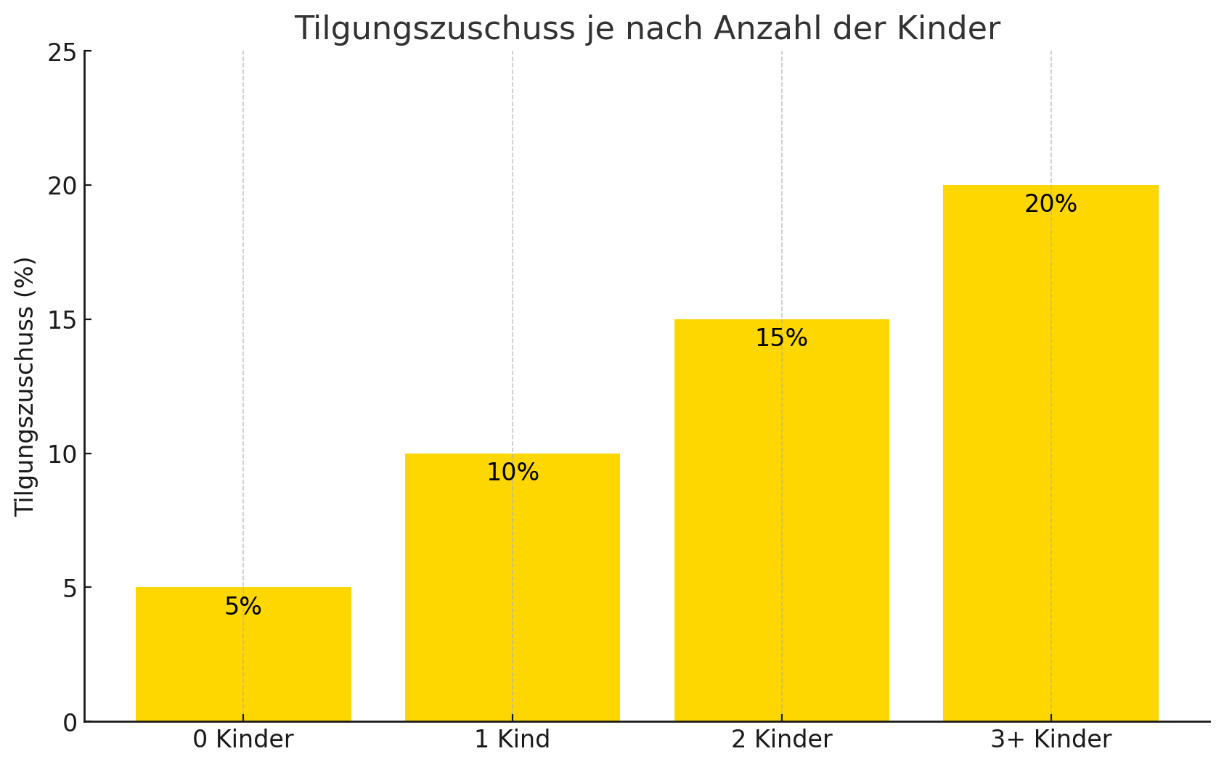 - Familienfreundliche Unterstützung durch Tilgungszuschüsse zwischen 5-20 %, abhängig von der Anzahl der Kinder im Haushalt.