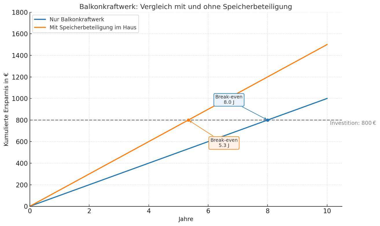 Herr Schneider wohnt zu Miete und hat sich 2025 für ein 600-Watt-Balkonkraftwerk entschieden, das rund 800 € kostete. Weil im selben Haus eine größere PV-Anlage mit Speicher installiert wurde, profitiert er als ESWE-Kunde zusätzlich vom gemeinsam genutzten Solarstrom. Damit senkt er seine Stromkosten jährlich um etwa 150 €. Die kleine Anlage rechnet sich bereits in wenigen Jahren.